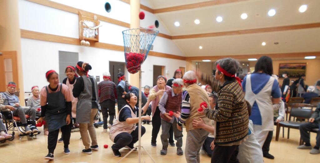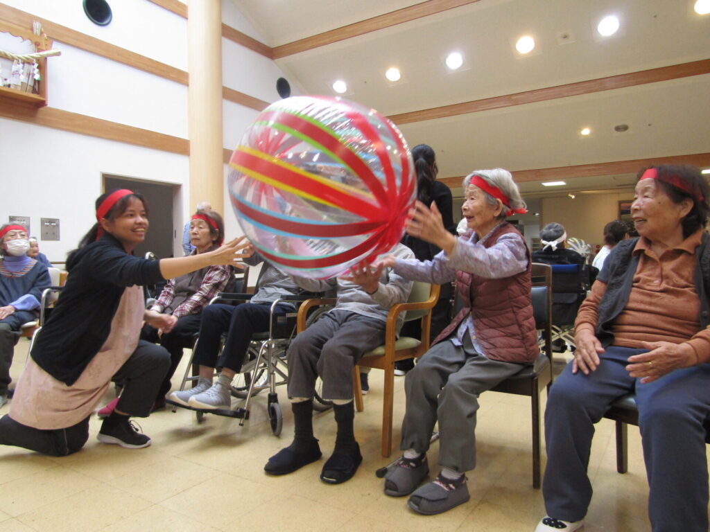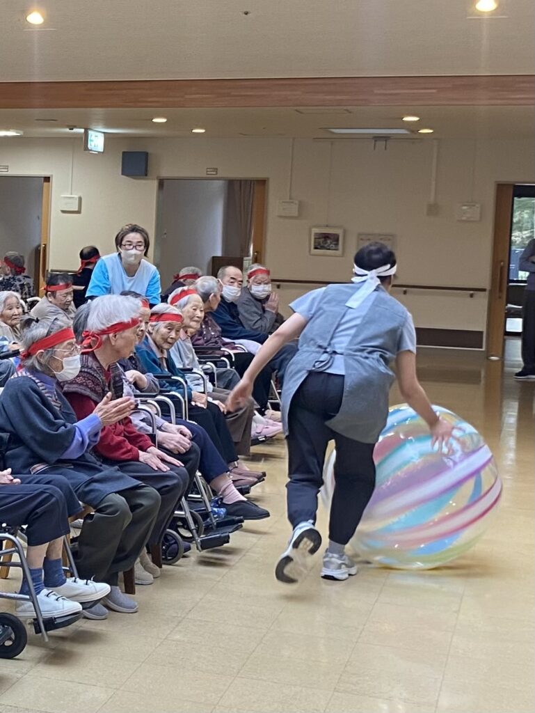 この日の曇り空もお年寄りと職員たちの熱意が青空に変えて、楽しい運動会になりました。