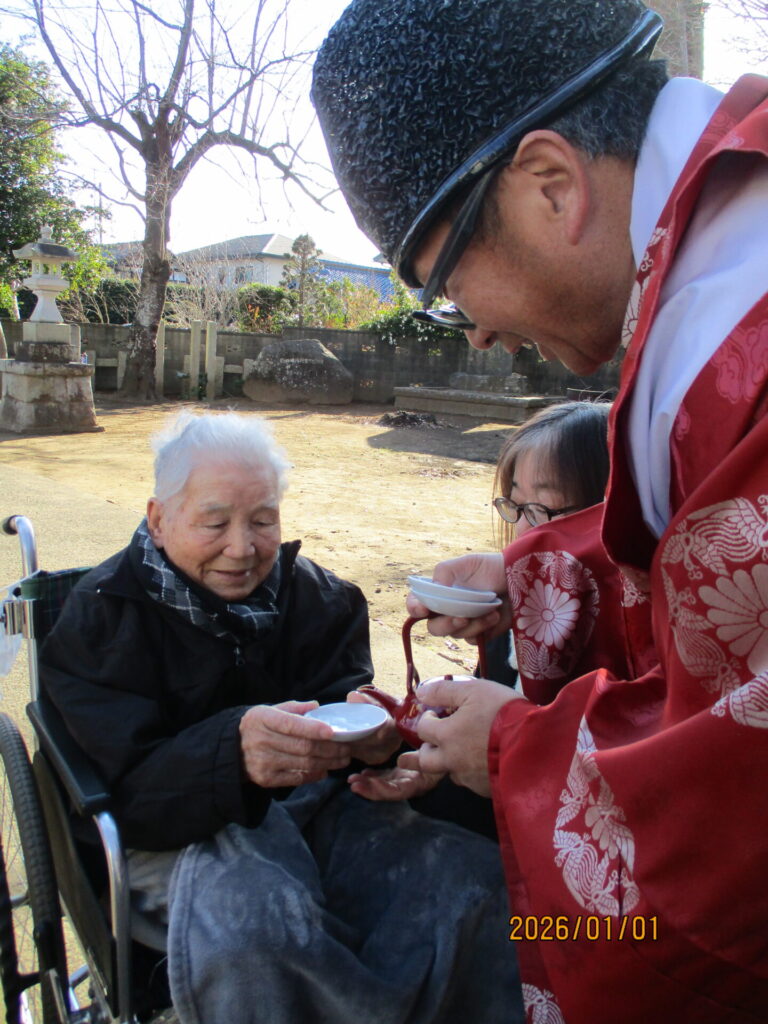 御神酒をいただき、お年寄りや職員の皆さんが良い年になるよう、